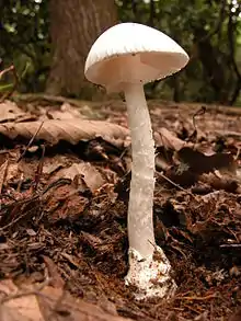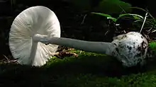 Quando jovens, os cogumelos são envoltos por uma membrana chamada véu universal, que se estende a partir do topo do chapéu até a base do tronco, conferindo-lhe uma forma oval. Nos corpos de frutificação maduros, os remanescentes do véu formam uma membrana ao redor da base, a volva, como um copo em forma de casca de ovo. No entanto, a volva permanece sob o solo ou se rasga durante o desenvolvimento. Ela é branca, por vezes lobada, e pode ficar bastante pressionada contra a estipe.[14] A volva atinge até 3,8 cm de altura (medidos a partir da base do bulbo), e tem cerca de 2 milímetros de espessura no meio do caminho entre o topo e o local onde se fixa na base.[11] O odor do cogumelo tem sido descrito como "agradável a um pouco nauseante",[10] tornando-se mais enjoativo quando o corpo de frutificação envelhece.[11]