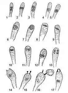 Em 1906, Charles E. Lewis estudou e ilustrou o desenvolvimento dos basídios, a fim de comparar o comportamento nuclear naqueles que possuem dois esporos com os que possuem quatro. Inicialmente, o basídio jovem é preenchido com citoplasma e contém dois núcleos primários, que têm nucléolos distintos (1). Com o crescimento do basídio, as membranas nucleares se aproximam (2), e em seguida desaparecem no ponto de contato entre elas (3). Os dois núcleos primários permanecem distintos por um curto período de tempo, e logo fundem-se completamente para formar um núcleo secundário maior, com um único nucléolo secundário (4, 5). O basídio aumenta de tamanho após a fusão dos núcleos primários, e o núcleo resultante migra para uma extremidade do basídio (6, 7). Durante este tempo, o núcleo desenvolve vacúolos "preenchidos pela seiva nuclear na célula viva". Os cromossomos são produzidos a partir de filamentos de nucléolos, e alinham-se transversalmente perto do vértice do basídio, ligados pelo fuso mitótico (8-10). Os cromossomos se dirigem então aos pólos, formando os núcleos filhos que ocupam diferentes posições no basídio; os filhos agora têm uma estrutura semelhante a do núcleo mãe (11). Em seguida os dois núcleos se dividem para formar quatro núcleos, semelhantes aos fungos com basídios de quatro esporos (12, 13). Os quatro núcleos se aglomeram a alguma distância a partir da extremidade do basídio para formar uma massa irregular (14). Pouco tempo depois, os esterigmas (saliências finas de basídios que unem os esporos) começam a se formar (15), e o citoplasma começa a passar através dos esterigmas para formar os esporos (16). Embora Lewis não tenha sido capaz de determinar com clareza, apenas a partir da observação, se os conteúdos de dois ou quatro núcleos passaram pela esterigmas, deduziu, examinando basídios velhos com esporos maduros, que apenas dois núcleos penetram nos esporos (16, 17).[4]