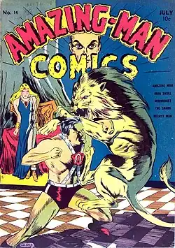 ![]() Capa de Amazing-Man Comics 14 (julho de 1940). Arte de Lew Glanzman | |