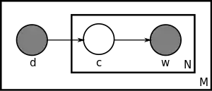 c representa um tópico e w é uma palavra. Note que o número de tópicos é um hiper-parâmetro que deve ser escolhido com antecedência e não é estimado a partir dos dados. A primeira formulação é a de simetria, onde e são gerados a partir da classe latente de forma semelhante (usando as probabilidades condicionais e ). A segunda formulação é a de assimétria, onde, para cada documento , classe latente é escolhida condicionalmente para o documento de acordo com a probabilidade e uma palavra é gerada a partir dessa classe, de acordo com . Apesar de ter usado palavras e documentos neste exemplo, a co-ocorrência de qualquer par de variáveis discretas pode ser modelada exatamente da mesma maneira.