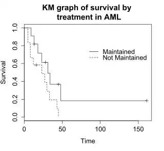 Este exemplo usa o conjunto de dados "aml" do pacote de "survival" do software R. O conjunto de dados é de Miller(1997)[3] e a questão, em estudo, é se o curso padrão da quimioterapia deve ser estendido ('mantido') para ciclos adicionais.