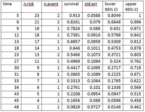 - "n.risk" é o número de sujeitos em risco de experimentar o evento imediatamente antes do instante t. Aqui "estar em risco" significa que o sujeito não experimentou o evento antes do tempo t, e não foi censurado antes ou no instante t.