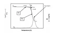 A Tg obtida pelo onset da curva de E’, é determinada a partir da interseção de duas retas tangentes ao módulo de armazenamento (E’). A primeira linha tangente (linha A ou TA) é selecionada a partir de um ponto, na escala de temperatura antes da transição e a segunda linha tangente (linha B ou TB) é construída a partir do ponto de inflexão (Figura 4).