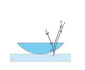 O raio luminoso incidente chega à superfície da lente convexa, onde parte da luz é refletida e parte é refratada. O raio 2,refletido, não causa uma mudança de fase, isso porque a luz passa de um meio com índice de refração maior para um índice de refração menor, no caso da lente para o ar. Já o raio 1, refratado, causa uma mudança de fase de 180° ou λ/2, pois passa de um meio com índice refração menor para outro com índice de refração maior, isto é, do ar para o vidro. Esses raios causarão uma interferência construtiva (anéis claros) se 2L = (m+1/2). λ ou uma interferência destrutiva (anéis escuros) se 2L=m.λ, com m= 0,1,2,3...[1]