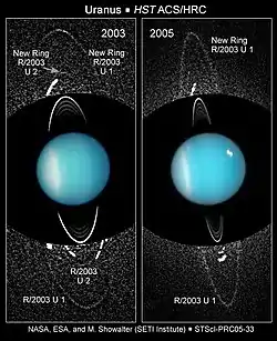 - Notícia: Hubble Discovers Giant Rings and New Moons Encircling Uranus – Comunicado de imprensa do Telescópio Espacial Hubble (22 de dezembro de 2005). (em inglês)