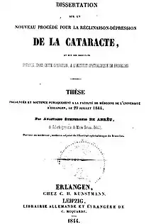 - de Abrêu, Anastasio Symphronio (1844). «Dissertation sur un nouveau procédé pour la reclinaison-dépression de la cataracte et sur les résultats obtenus par ce procédé, à l'Institut ophthalmique de Bruxelles: thèse présentée et soutenue publiquement à la faculté de médecine de l'Université d'Erlangen le [sd] juillet 1844». Consultado em 29 de junho de 2022