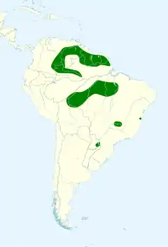 Pode ser encontrada nos seguintes países: Argentina, Bolívia, Brasil, Colômbia, Guiana Francesa, Guiana, Paraguai, Suriname e Venezuela.