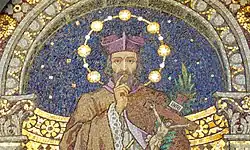 | Atribuições | Paramentos sacerdotais, palma do martírio |
