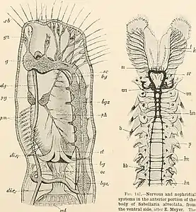 O sistema nervoso em anelídeos, de uma maneira geral, é composto por diversos gânglios dispostos ao longo de seu corpo, ligados por um, ou mais, cordões ventrais. Do gânglio cerebral, localizado na região da faringe, porção superior do peristômio ou prostômio (característica importante para a classificação),[8] saem dois conectivos circum-entéricos, que passam ao redor do tubo digestivo e se encontram na parte ventral do corpo, formando o gânglio subesofágico.[3] Então, a partir deste ponto, normalmente irradiam-se dois feixes nervosos que correm ao longo do corpo e se comunicam por neurônios transversais, numa disposição similar a uma escada de cordas.[9][10] Cada metâmero tem um par de gânglios, um conectado ao seu respectivo feixe e também a uma rede neural que se ramifica à superfície corporal.