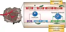 A infiltração de leucócitos em locais de inflamação depende da interação dos leucócitospresentes na circulação com a parede vascular. Essa interação e o extravasamento de leucócitos são mediados por moléculas de adesão celular tanto nos leucócitos quanto no endotélio . As células endoteliais normalmente expressam baixos níveis de moléculas de adesão, mas em locais de inflamação essas moléculas são superexpressas devido à exposição a citocinas inflamatórias, como interleucina 1, interferon gama e fator de necrose tumoral alfa.