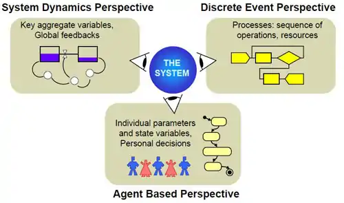 Dinâmica de sistemas e eventos discretos são os tradicionais paradigmas de simulação. Modelagem baseada em agentes é o mais recente paradigma. Tecnicamente, a abordagem de dinâmica de sistemas lida majoritariamente com processos contínuos, enquanto modelagem por eventos discretos e modelagem baseada em agentes funcionam majoritariamente por tempo discreto, por exemplo passando de um evento para o outro.