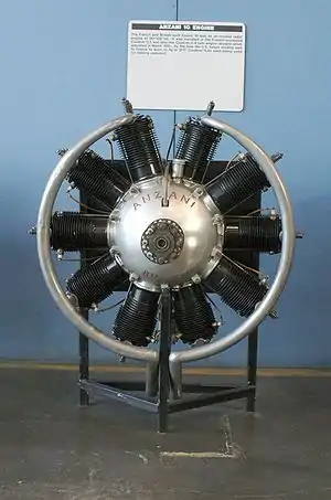 Na primeira década do século 20 o construtor Anzani desenvolveu seu motor de três cilindros em "W" vertical de motocicletas, que equipou a aeronave em que Louis Blériot utilizou para cruzar o Canal da Mancha em 1909, com um motor radial simétrico ou em "Y", e a partir deste desenvolveu outro radial de seis cilindros em duas linhas.[1]
