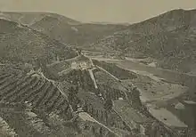 ![]() Quinta do Vesúvio, vista do rio, vendo-se a via férrea atrás, sobre talude; à esquerda, túnel de acesso viário sob a linha. |