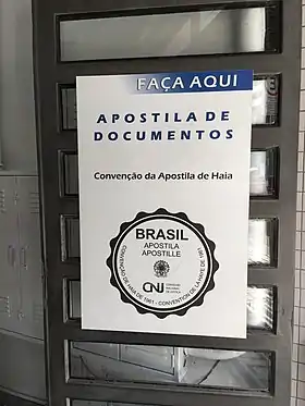 Em 29 de janeiro de 2016 a presidente da República promulgou Convenção que entrou em vigor em 14 de agosto do mesmo ano[8][9]. Foi criada uma estrutura para a emissão das apostilas sob responsabilidade do Conselho Nacional de Justiça[10]. O sistema é denominado "SEI Apostila"[11]. Num primeiro momento, apenas os cartórios de notas e registro das capitais dos estados estarão habilitados a emitir apostilas[12].