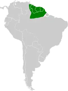 Pode ser encontrada nos seguintes países: Bolívia, Brasil, Guiana Francesa, Guiana, Suriname e Venezuela.[1]
