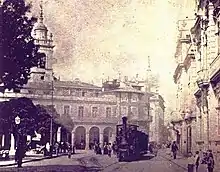 Frente à arcada passava uma linha de carris que teve uma linha com um vapor, mais tarde eletrificado. Presente na praça estava um chafariz antigo, hoje devolvido ao Mosteiro de Tibães e substituído por um modelo moderno.