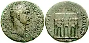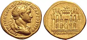 Um arco construído em homenagem ao imperador Trajano foi decretado pelo Senado em 117. Durante o século XIX, os historiadores formularam várias hipóteses a respeito de sua localização, que ficava provavelmente no centro do próprio Fórum de Trajano, seja como uma entrada triunfal a partir do vizinho Fórum de Augusto, seja como uma estrutura independente.