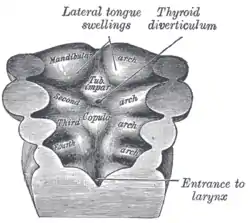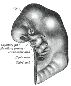 Durante o desenvolvimento embrionário surgem, por volta das 4 a 5 semanas (no Homem) uma série de estruturas chave para o desenvolvimento da cabeça e pescoço: os arcos faríngeos ou arcos branquiais. Contribuem assim decididamente para a aparência externa do embrião. Inicialmente eles consistem em segmentos de tecido mesenquimatoso separado pelas fendas branquiais. Simultaneamente, desenvolvem-se nas paredes laterais do intestino faríngeo as bolsas faríngeas. Estas penetram no mesênquima mas não estabelecem uma comunicação externa com as fendas.