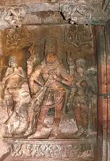 - Rao pp. 327–8: "The male half of the four-armed Ardhanarishvara at Badami wears snake ornaments and a knee-length deerskin dress and holds a parashu. His jatamukuta is adorned by the crescent moon as well as a skull. The female side wears gold ornaments and an ankle-length silk garment, and carries a nilotpala. Together with the remaining arms, Ardhanarishvara plays a veena. The skeleton figure identified with Bhringi stands beside him. The bull stands behind the deity."