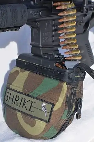 ![]() Shrike 5.56 com uma bolsa de fita de munição da M249. | |