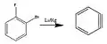A reação começa com a remoção do próton orto ao grupo de saída. O bromo remove densidade eletrônica, esta estabilização é fraca e isso só ocorre com bases fortes.