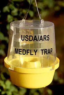 Armadilhas de insetos são usadas para monitorar ou reduzir diretamente populações de insetos ou outros artrópodes, capturando indivíduos e matando-os. Eles normalmente usam alimentos, iscas visuais, atrativos químicos e feromônios como isca e são instalados de forma que não prejudiquem outros animais ou humanos ou resultem em resíduos em alimentos ou rações. As iscas visuais usam cores e formas claras e brilhantes para atrair pragas. Atrativos químicos ou feromônios podem atrair apenas um sexo específico. Armadilhas de insetos às vezes são usadas em programas de manejo de pragas em vez de pesticidas mas são mais frequentemente usados para observar padrões sazonais e de distribuição de ocorrência de pragas. Esta informação pode então ser usada em outras abordagens de manejo de pragas.