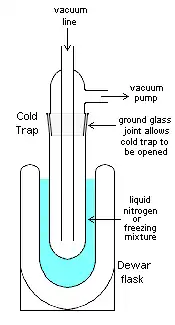 Em aplicações de vácuo, uma trampa fria é um dispositivo que condensa todos os vapores em um líquido ou sólido, exceto os gases permanentes.[2] O objetivo mais comum é evitar que os vapores de uma bomba de vácuo contaminem o experimento ou amostra de interesse. A armadilhas frias também se referem à aplicação de superfícies de refrigeração ou defletores para evitar que os vapores de óleo fluam desde o interior de uma bomba de vácuo até um determinado recipiente. Em tal caso, um defletor ou uma seção de tubulação que contém uma série de palhetas resfriadas, será acrescentado à entrada de um sistema de bombeio. Esfriando o defletor, seja com um refrigerante como o nitrogênio líquido, ou mediante o uso de um elemento Peltier de acionamento elétrico, as moléculas de vapor de óleo que atingem as palhetas defletoras se se condensarão e portanto serão eliminados da cavidade de bombeio.