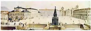 A chegada ao Brasil da Missão Francesa de 1816, foi um ponto crucial na difusão dos ideais neoclássicos a partir da capital, incentivada pela necessidade de se reorganizar a planta urbana do Rio após a chegada da família real portuguesa.[64] O arquiteto vindo com a Missão, Grandjean de Montigny, tornou-se professor de arquitetura da Escola Real de Ciências, Artes e Ofícios, fundada por D. João IV em 1816. Ainda durante o período colonial, Grandjean projetou a Praça do Comércio do Rio, construído entre 1819 e 1820, um edifício de planta centrada com uma grandiosa cúpula. Também projetou o edifício-sede da Escola, inaugurada apenas em 1826, considerado uma expressão pura do neoclássico francês em seu desenho, com fachada simétrica e um grande portal centralizado em ordem jônica, único elemento que chegou aos dias de hoje, instalado no Jardim Botânico do Rio de Janeiro. Apesar de haver construído pouco do que projetou, as aulas de arquitetura de Grandjean formaram vários arquitetos que tiveram destacado papel na afirmação do estilo neoclássico durante todo o período do Império.
