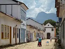 Nas vilas e cidades grande parte das residências era de um só pavimento, enquanto as mais nobres podiam ter um segundo pavimento — sendo então chamadas sobrados — ou até mais, podendo atingir quatro pavimentos em alguns centros importantes, como Recife, Salvador e São Luís. As casas no Brasil eram em geral de alvenaria de pedra ou taipa de pilão com paredes divisórias de pau a pique, com exceção de Pernambuco, onde era mais comum o uso do tijolo.[60] A cantaria de pedra, quando existente, se limitava aos cunhais (esquinas) da casa. O piso térreo tinha chão de terra batida, enquanto os demais pavimentos tinham pisos de tabuado de madeira. O térreo era utilizado para atividades comerciais, depósito, cocheiras e aposentos de escravos, tendo também um corredor que levava ao quintal nos fundos e uma escada que levava ao piso superior. O segundo pavimento - pavimento nobre - era dedicado à habitação. Este se organizava com um grande salão que dava para a rua, do qual saía um corredor que tinha de cada lado pequenos quartos sem aberturas ao exterior (alcovas). O perfil das janelas era retangular ou em arco abatido, emolduradas em madeira ou, mais raramente, em pedra. Os pavimentos nobres podiam ter sacadas com gradis de ferro trabalhado. As janelas superiores também podiam ser cobertas com muxarabis ou treliças de madeira, enquanto que as janelas de vidro só passaram a ser comuns no final do século XVIII. Os telhados eram de duas ou quatro águas com beiral, às vezes com alguma ornamentação discreta como uma suave curvatura e telhas em bico nos cantos do telhado.