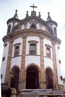 As torres circulares ou semicirculares (às vezes poligonais), posicionadas de maneira recuada em relação à fachada, fizeram escola em Minas Gerais, sendo encontradas por exemplo na Matriz de Barão de Cocais (antes de 1785) e nas Igrejas da Ordem Terceira do Carmo de São João del Rei (depois de 1787) e de Mariana (depois de 1783).[45] Torres circulares são ausentes da arquitetura do litoral brasileiro e da metrópole, com exceção da demolida São Pedro dos Clérigos do Rio.[38]