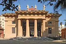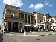 A fachada do Teatro San Carlo, iniciada em 1810 pelo toscano Antonio Niccolini , é estritamente francesa e florentina, com uma simples colunata jónica disposta sobre a parte superior dum um alto pórtico inspirado na fachada da Villa di Poggio Imperiale em Florença, em grande parte projetada alguns anos antes por Pasquale Poccianti.[25] Nos anos seguintes, a atividade de Niccolini foi intensa: ele projetou o complexo da Villa Floridiana em Vomero , dentro do qual construiu a Villa Lucia, projetou a nova fachada do Palazzo Partanna na piazza dei Martiri, foi contratado para reedificar o interior do Teatro San Carlo após o incêndio de 1816 e também se dedicou a numerosos projetos, entretanto não realizados, para a recuperação do Palácio Real.[26]