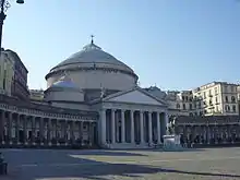 A igreja de São Francisco de Paula, por outro lado, está entre as mais importantes construções arquitectónicas sagradas desse período, tanto que é considerada pelos críticos como "a mais rica e fidedigna das novas igrejas italianas".[27] A sua construção, relacionada com as complexas vicissitudes políticas do Reino de Nápoles, foi incorporada como coroamento do Largo di Palazzo. A primeira ideia para ordenar a praça que se abria frente ao Palácio Real foi de Giuseppe Bonaparte, mas o início das obras deve-se a Gioacchino Murat, que em 1809 anunciou um concurso para o respectivo projeto. No concurso foi o projecto de Leopoldo Laperuta que venceu, com uma colunata elíptica em frente ao Palácio Real. Com a Restauração dos borbónicos de Nápoles, o rei Fernando queria dar maior destaque ao templo que deveria estar no centro da colunata. Foi anunciada um segundo concurso em que, depois de várias controvérsias, se destacou no projeto do arquiteto de Lugano, Pietro Bianchi (1787-1849). Bianchi fez uma igreja fortemente inspirada no Panteão de Roma, diferenciando-a apenas nas suas proporções e na presença de duas cúpulas menores nas laterais da cúpula principal.[28] O efeito geral foi capaz de graduar a transição entre a ordem monumental da praça e os confusos blocos habitacionais localizados na encosta do Pizzofalcone. O interior da igreja, no entanto, é mais pobre do que o exterior, fazendo sobressair uma frieza comemorativa na rica decoração em mármore, estuque e guinaldas. Este óbvio desfasamento criou a dúvida de que o neoclassicismo se adequava melhor à arquitectura das vilas, palácios, teatros e residências reais do que com a arquitectura das igrejas; por este motivo, um pouco mais tarde, a arquitetura eclesiástica voltou-se para o neogótico.[29]