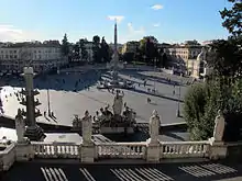 Antes da intervenção de Valadier, a piazza del Popolo aparecia como um espaço caótico, ainda que fortemente caracterizado, compreendido entre a Porta del Popolo e a igreja barroca de Carlo Rainaldi. Em 1793, tendo em conta as indicações de um concurso feito vinte anos antes, o arquiteto apresentou uma primeira proposta para a sistematização da praça, caracterizada por um espaço arquitectónico em forma de trapézio, com grandes edifícios destinados ao imobiliário, blindados por duas ordens de colunas. A este projeto seguiu-se um segundo, no qual a planta trapezoidal se manteve, mas em vez dos longos edifícios previstos na solução inicial, foram inseridas duas cancelas, além das quais eram previstos grandes jardins. O projeto final, que foi afetado por algumas mudanças introduzidas por Louis-Martin Berthault, foi aprovado em 1813. Valadier confere à praça uma forma elíptica, com a inclusão de dois muros monumentais, simetricos, ao lado das igrejas germinadas de Rainaldi; além disso ligou os dois hemiciclos com a Via del Babuino e di Ripetta graças à presença de novos edifícios, e à análoga simetria dada ao lado voltado para a Basílica de Santa Maria del Popolo. Como tem sido observado pelos críticos, na Piazza del Popolo o neoclassicismo não se tornou o elemento dominante, mas contribuiu para a perfeita coexistência entre as diferentes emergências arquitetônicas.[18]