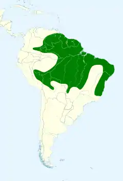 Pode ser encontrada nos seguintes países: Bolívia, Brasil, Colômbia, Guiana Francesa, Guiana, Peru, Suriname e Venezuela. Seus habitats naturais são: florestas subtropicais ou tropicais húmidas de baixa altitude.[1]