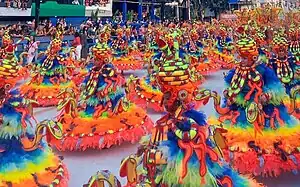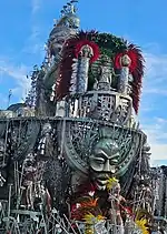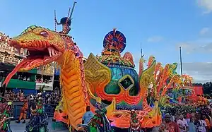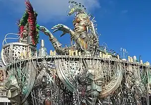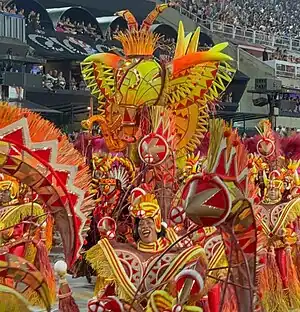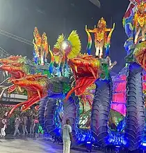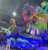 Alegoria 3: "As Guerreiras Mino: Proteção Mística e Lealdade"![]() ![]() A alegoria era preenchida por esculturas de guerreiras em meio a espinhos e grandes marfins, fazendo referência à preparação das mulheres para as batalhas, e as estratégias de camuflagem na paisagem típica da planície costeira do Daomé. No centro do carro alegórico, uma grande escultura de elefante, estilizado nas cores da alegoria. Em cima do elefante, a bailarina Egili Oliveira interpretou Na Huanjile, uma misteriosa sacerdotisa vodum e Kipojitó (rainha-mãe), responsável pelo treinamento mental, espiritual e físico das guerreiras Mino. Na traseira do carro, a reprodução de um barco vodum suspenso com quatro esculturas africanas dentro. O barco simbolizou a travessia de daomeanos escravizados para o Brasil, fazendo uma conexão com o setor seguinte, que tratou da chegada de Ludovina Pessoa ao Brasil. Grupo performático 1: "Guerreiras em Luta" Em volta da alegoria desfilou um grupo performático de mulheres, representando as guerreiras Mino. Em determinado momento da coreografia, as mulheres subiam na base do carro, ficando camufladas entre as reproduções de espinhos. |