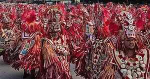 ![]() Ala 1 à frente do primeiro tripé. A primeira ala do desfile fez referência a batalha entre Aladá e Uidá, territórios vizinhos localizados na costa atlântica da África. No ano de 1660 houve uma intensa luta entre os dois reinos. Durante o combate, uma serpente que habitava Aladá atravessou para o lado de Uidá, que venceu a batalha. A serpente passou a ser cultuada pela população de Uidá como símbolo da vitória. A ala é dividida em dois grupos com fantasias em cores diferentes: os de laranja representando Uidá e os de verde simbolizando Aladá. Os dois grupos encenaram uma batalha. Os braços da fantasia tinham a forma de uma serpente, com a cabeça em um braço e a cauda em outro. |