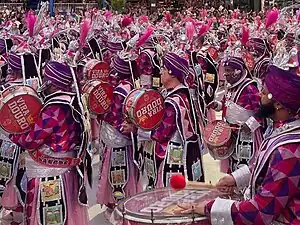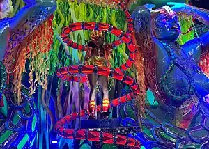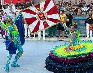 Ala 11 (Bateria): "A Revolta dos Malês"![]() Durante o desfile, a bateria executou bossas com atabaques e agogôs, inspiradas nos toques do adahum do Candomblé Jeje. Mestre de bateria (Ciça): "Mestre Alufá Licutan" Mestre Ciça desfilou representando Mestre Alufá Licutan, um dos líderes da Revolta dos Malês.[46] Rainha de bateria (Erika Januza): "Takará" Rainha de bateria da Viradouro desde 2022, a atriz Erika Januza desfilou com uma fantasia em alusão ao takará, instrumento ritualístico pontiagudo utilizado pelos iniciados no vodum Dangbé durante o processo de transe. Na fantasia, confeccionada pelo estilista Vitor Carpe, foram utilizados 180 búzios verdadeiros banhados a prata.[47] |