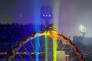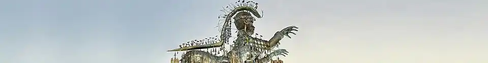 ![]() O primeiro tripé do desfile reproduziu a coroa, símbolo da escola, envolvida por uma grande serpente, representando Dangbé. A traseira do tripé tinha a forma de armas de luta utilizadas na batalha de Uidá contra Aladá. Sobre a abóbada central, no meio da coroa, desfilou o cabeleireiro Maurício Pina com a fantasia "Beti - O Grande Sacrificador", representando o sacerdote supremo do culto a Dangbé, com poderes de adivinhação. Na frente, em cima da cabeça da serpente, desfilou a modelo Duda Almeida, com fantasia de guerreira, simbolizando "A Energia de Dangbé". |
