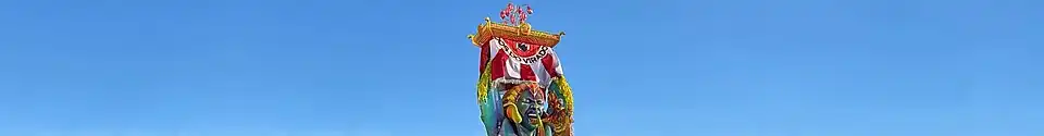 Alegoria 5: "Templos Sincréticos"![]() Nas varandas laterais da alegoria, composições com a fantasia "Irmandade Jeje-baiana". No chão, à frente do carro alegórico, desfilou a musa Thays Busson com a fantasia "Dança aos Deuses Afro-Baianos" em referência ao sincretismo entre São Bartolomeu e Dangbé. |