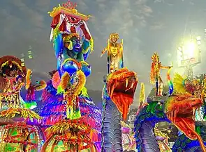 ![]() Ala 21, sobre o vodum Mawu. A ala de adolescentes da Viradouro fez alusão ao vodum Mawu, ligado à lua e à noite. Mawu é o ser supremo dos povos Fons, responsável por criar a terra e os seres vivos. Ala 22: "O Cair da Chuva" ![]() Ala 22: "O Cair da Chuva". A ala simbolizou a mística ligação do vodum Dangbé com a água. Segundo o roteiro do desfile, "as serpentes da família de Dan possuem relações com os ciclos da água. As gotas que caem do céu, as forças lacustres, o formato de serpente dos rios e igarapés, a capilaridade da água por dentro das árvores. Fenômenos naturais que se manifestam e se apresentam para trazer Dan em rastro luminoso que se espraia quando as Dans deixam a terra (ayí) e voltam para o céu. Completa-se, enfim, o ciclo das águas para manter o equilíbrio do nosso ecossistema". Componentes desfilaram com fantasias em tons de rosa, decoradas com fios de LED que simbolizavam o cair das águas. |