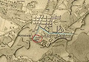O Arsenal Potsdam, foi construído em um terreno a leste do canal de drenagem perto de sua entrada para o rio Havel. Ao mesmo tempo que a fábrica foi construída, o rei mandou expandir este canal como uma rota de transporte para o canal da cidade de Potsdam e a rua não pavimentada An der Gewehrfabrik (hoje: Hoffbauerstraße). A pavimentação ocorreu 40 anos depois.
