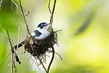 A época de reprodução é de novembro a fevereiro. O ninho é uma taça rasa feita de folhas e gravetos, tecidos com teias de aranha e material vegetal desfiado e decorada com líquen. Geralmente é colocado em um laço pendurado de videira bem longe do tronco ou folhagem de uma árvore de tamanho considerável a cerca de 2 a 2–10 m (6.6–32.8 ft) acima do solo. Dois ovos brancos ovais tingidos de rosa manchados com lavanda e marrom-avermelhado são colocados medindo 19 mm x 14 milímetros.[11]