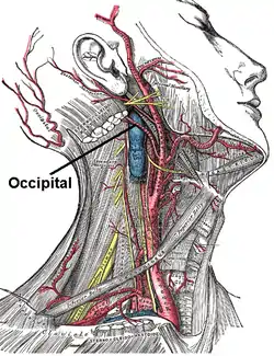 A artéria occipital origina-se da artéria carótida externa oposta à artéria facial. Seu caminho está abaixo do ventre posterior do digástrico até a região occipital. Esta artéria fornece sangue à parte posterior do couro cabeludo e aos músculos esternocleidomastóideos e aos músculos profundos das costas e pescoço.[1][2]
