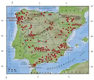 Toda a Península Ibérica possui sítios de arte rupestre esquemática. Embora predomine em zonas montanhosas com disponibilidade de abrigos rochosos, os vazios podem-se encher graças à arte móvel[9] esquemática (pois esta aparece também em sítios situados em vales, campinas e planícies), à que se tem de acrescentar a decoração de muitos megálitos. À parte disso, as maiores concentrações de estações esquemáticas estão nas montanhas da costa levantina, em Sierra Morena e nas serranias circundantes,[10] na bacia baixa do Guadiana e do Guadalquivir (até chegar à província de Cádis[11]), no estuário do Tejo, nas serras centrais da Meseta Central, onde sobressai a região de Las Batuecas (na Serra de Gata, entre Salamanca e Cáceres), com ramificações na província de Ávila, na faixa cantábrica, com extensões até a província de Leão e até um particular núcleo na Galiza que, devido à sua forte pessoalidade atlântica, acostuma ser estudado como fenômeno separado,[12] porém, a margem meridional da distribuição dos petróglifos galaicos (e.g. em Tras-os-Montes e Minho) apresenta uma certa permeabilidade para conceições próprias da Arte Esquemática.[13]
