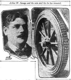 Foto de jornal Arthur Savage e um novo pneu de aço, por volta de 1911.