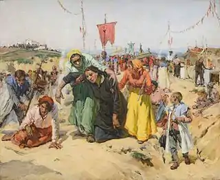 Na imagem destaca-se a mulher de negro, quase a cair, e ao seu lado a outra mulher de rastos, extenuadas de uma longa caminhada de joelhos sendo amparadas pela sua gente que as ajuda a recompor da auto-flagelação.[1]
