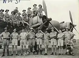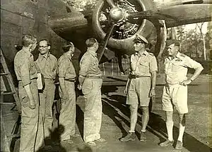 ![]() Comandantes do Esquadrão N.º 18 e da Asa N.º 79: Tenente-coronel Asjes (segundo à direita) e o Capitão de Grupo Ryland (à direita) em Batchelor, Território do Norte, em 1944 | |