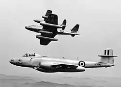 Em resposta à ameaça dos caças a jacto comunistas Mikoyan-Gurevich MiG-15, o Esquadrão N.º 77 foi retirado para Iwakuni em Abril de 1951, para ser re-equipado com aviões Gloster Meteor. Quatro oficiais da Real Força Aérea, com experiência em pilotar o Meteor, foram destacados para a Asa N.º 91 para ajudar na conversão e no treino dos pilotos australianos.[17] O esquadrão voltou à acção com a sua nova aeronave no dia 29 de Julho, operando a partir de Kimpo, na Coreia do Sul. Os aviões Mustang tinham sido muito eficazes no apoio aéreo aproximado, contudo o principal papel do Esquadrão Nº 77 na RAAF era a intercepção, e esperava-se que agora, com o Meteor, o esquadrão pudesse se concentrar na sua verdadeira missão.[18] De acordo com a história oficial da Austrália na Guerra da Coreia, a unidade provou o seu valor a nível diplomático e operacional; tendo sido um dos primeiros esquadrões da ONU a entrar em acção, compreendia um terço de toda a força a jacto no final de 1951, quando os confrontos no MiG Alley estavam no seu auge.[19] Contudo, combates aéreos entre os Meteor e os MiG, durante o mês de Agosto, convenceram o novo comandante Gordon Steege que os jactos australianos estavam ultrapassados, e a Quinta Força Aérea concordou em retirar os australianos da frente de combates aéreos; assim, os Meteor passariam a realizar missões de escolta e defesa aérea local.[18] A taxa de sucesso do esquadrão, no final do ano, era de uma baixa por cada quatro baixas ou capturas de inimigos.[20]
