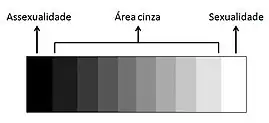 Os espectros da sexualidade humana: a assexualidade estrita na ponta esquerda, a área cinza entre os dois extremos e, na ponta direita, o espectro alossexual, que também é representado pelo arco-íris.