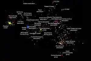 Grupos estelares jovens podem conter várias estrelas T Tauri jovens que ainda estão em processo de entrada na sequência principal. Essas populações esparsas de até mil estrelas T Tauri são conhecidas como associações T. O exemplo mais próximo é a associação Taurus-Auriga T (associação Tau-Aur T), localizada a uma distância de 140 parsecs do Sol.[10] Outros exemplos de associações T incluem a associação R Corona Australis T, associação Lupus T, associação Chamaeleon T e a associação Velorum T. As associações T são frequentemente encontradas nas proximidades da nuvem molecular a partir da qual se formaram. Alguns, mas não todos, incluem estrelas da classe O-B. Para resumir as características dos membros dos grupos móveis: eles têm a mesma idade e origem, a mesma composição química e têm a mesma amplitude e direção em seu vetor de velocidade.